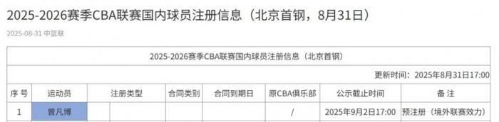直播吧8月31日讯 CBA官网今天更新了国内球员注册信息,北京男篮新增了曾凡博,状态为预注册,备注境外联赛效力。
